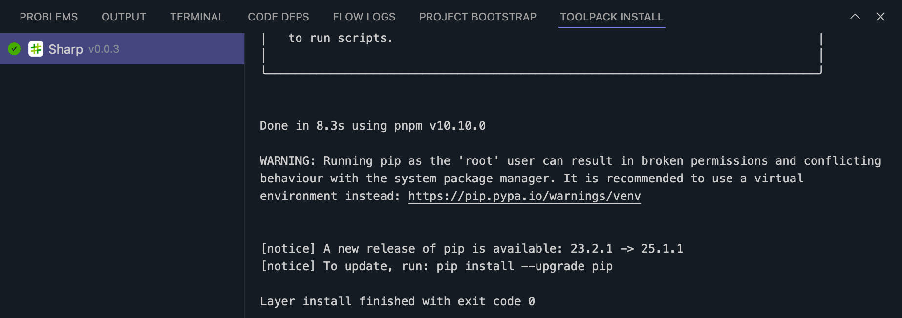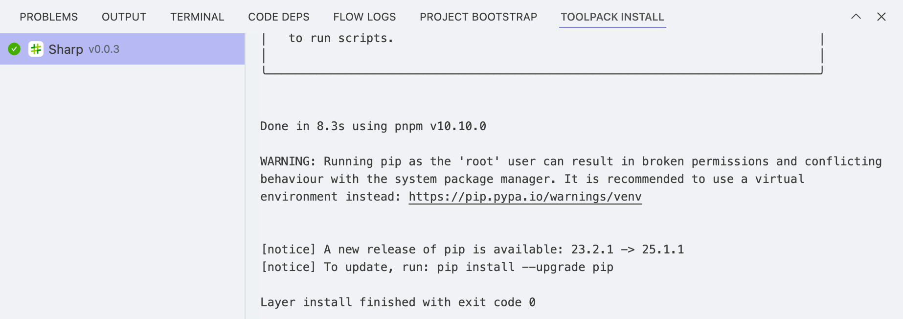 When you install third-party toolpack, logs of the toolpack installation will be displayed here.