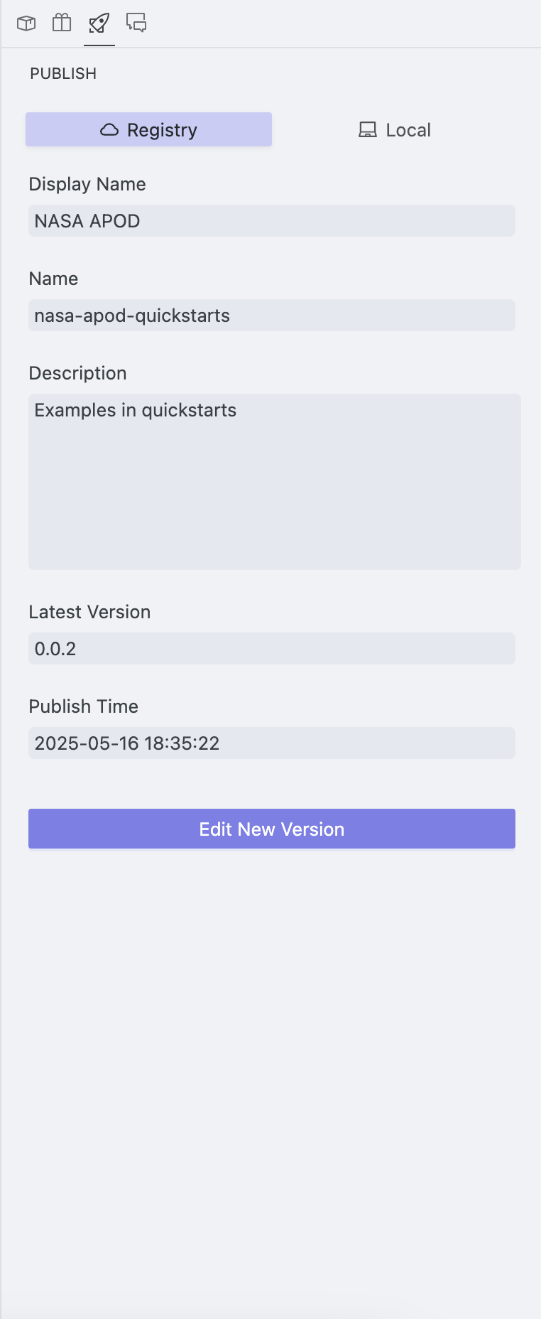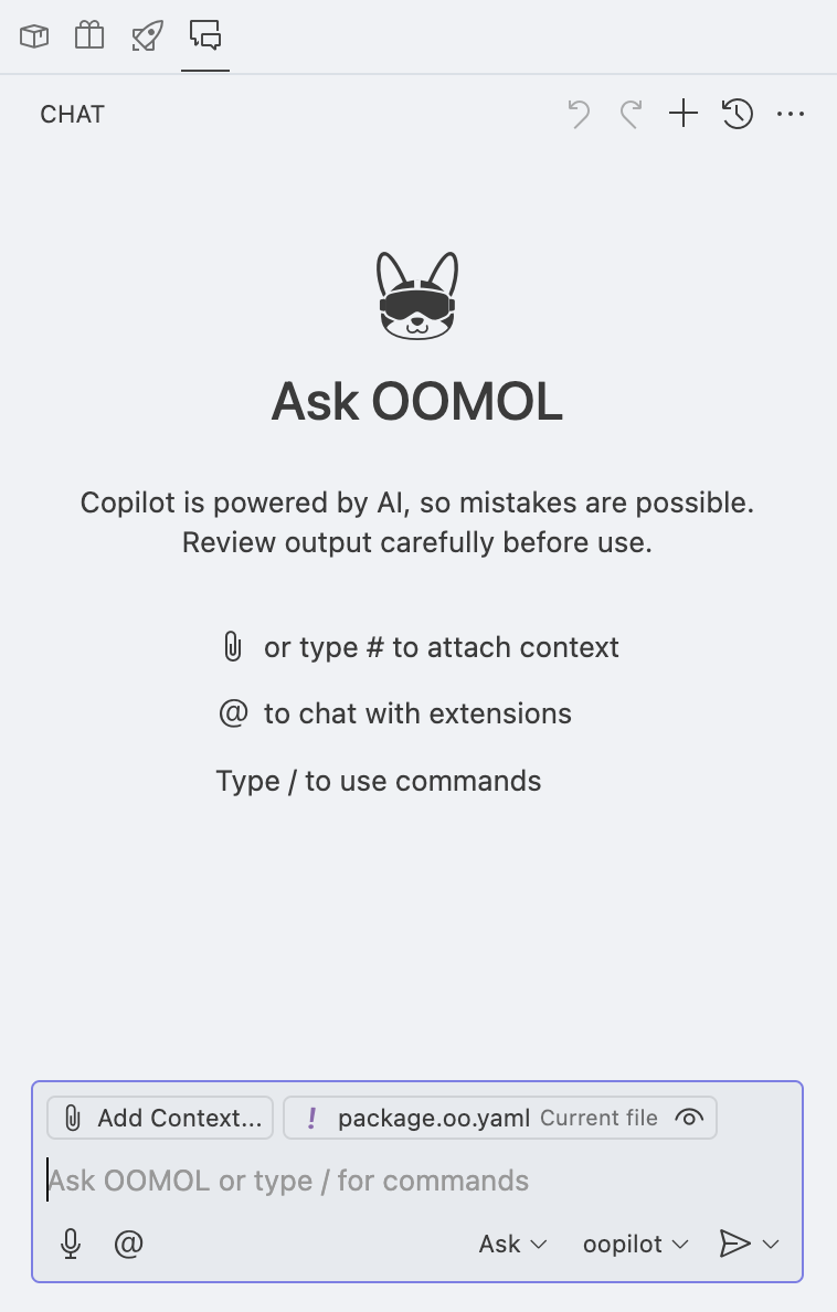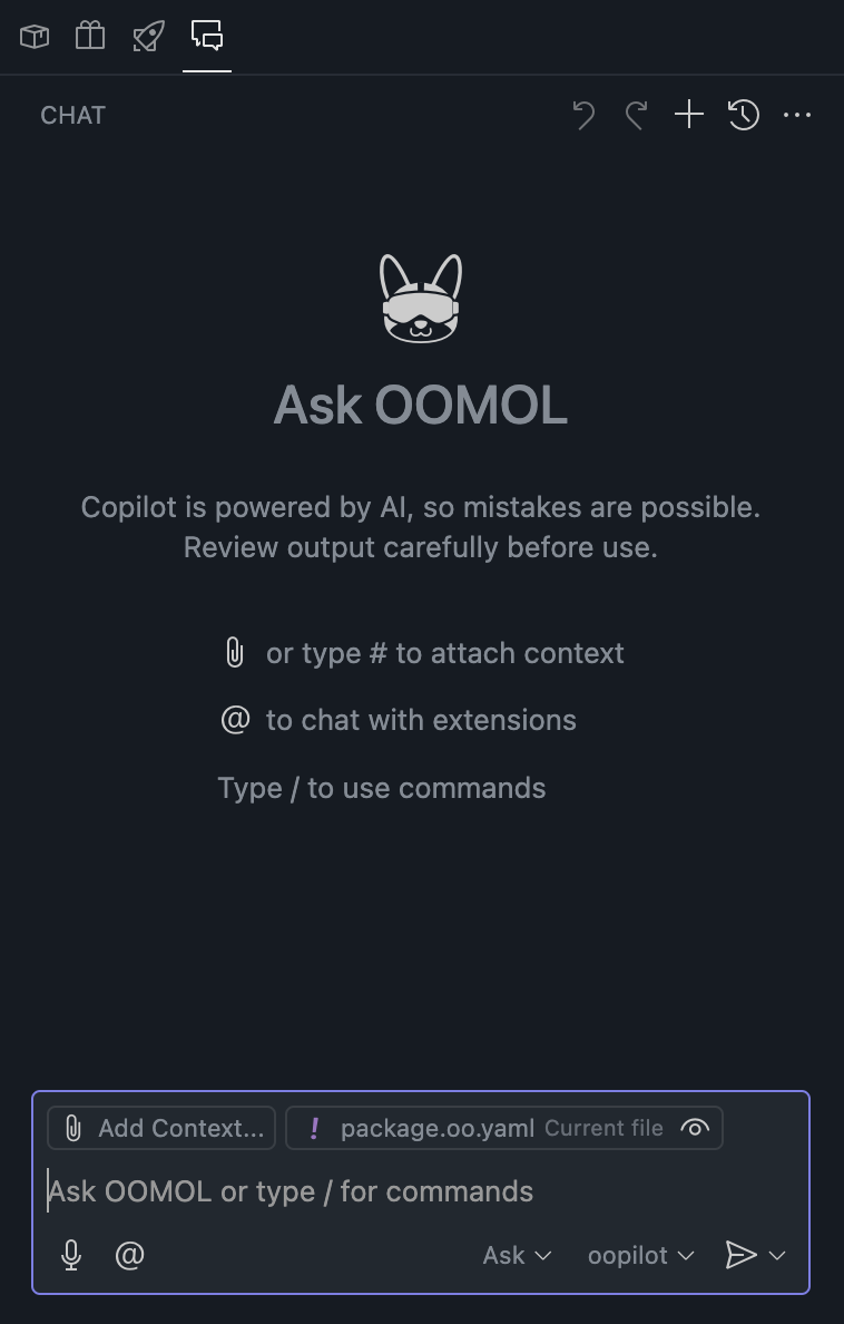 In this area, you can install and use toolpack, or publish the current project to the OOMOL Store. You can also use the AI assistant to complete certain tasks.
