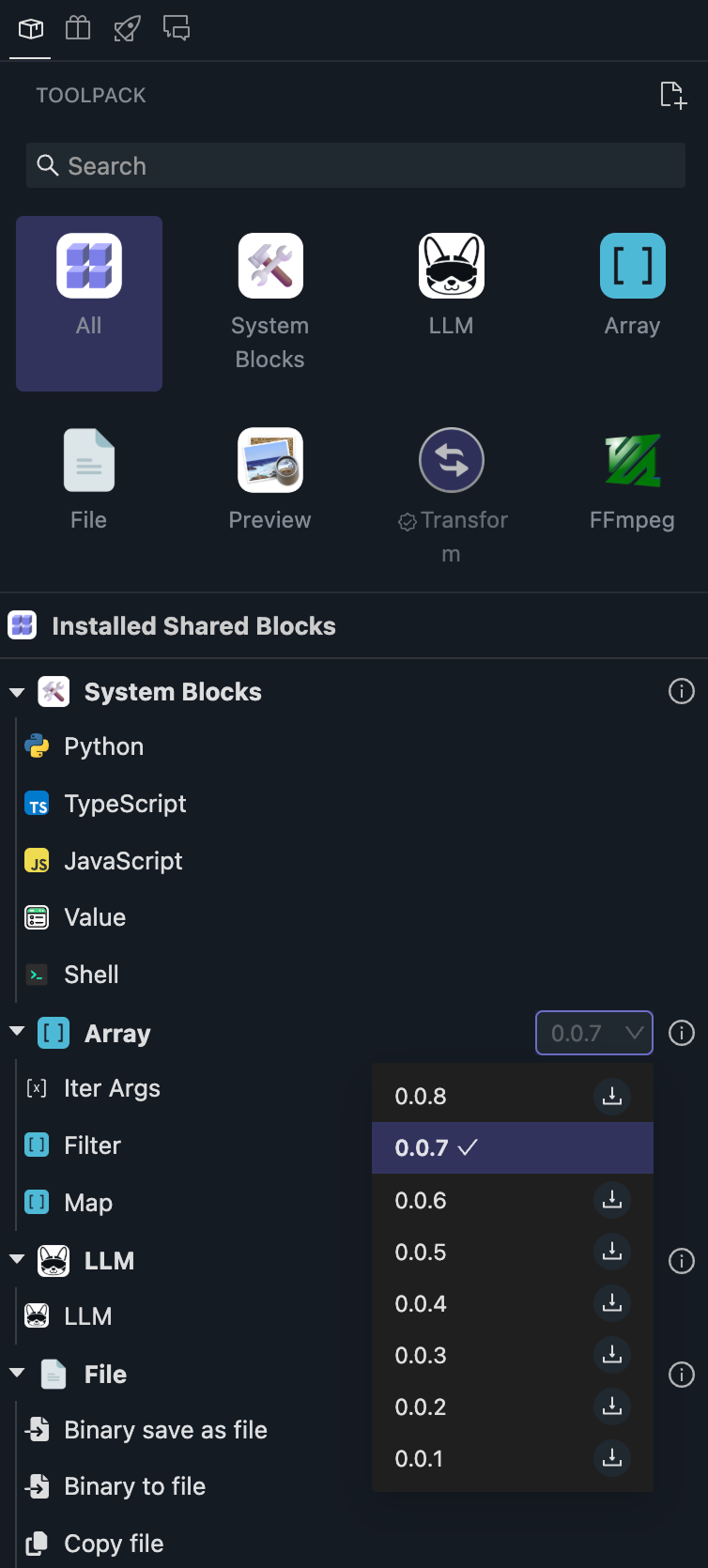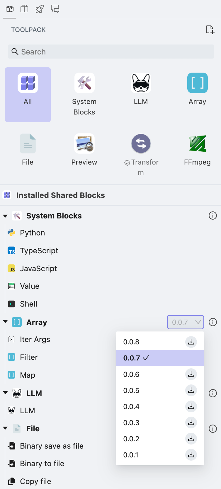 Each toolpack may contain one or more blocks; the package name is displayed above, and the block list is displayed below. Except for some built-in system blocks in OOMOL Studio, you can delete all others.