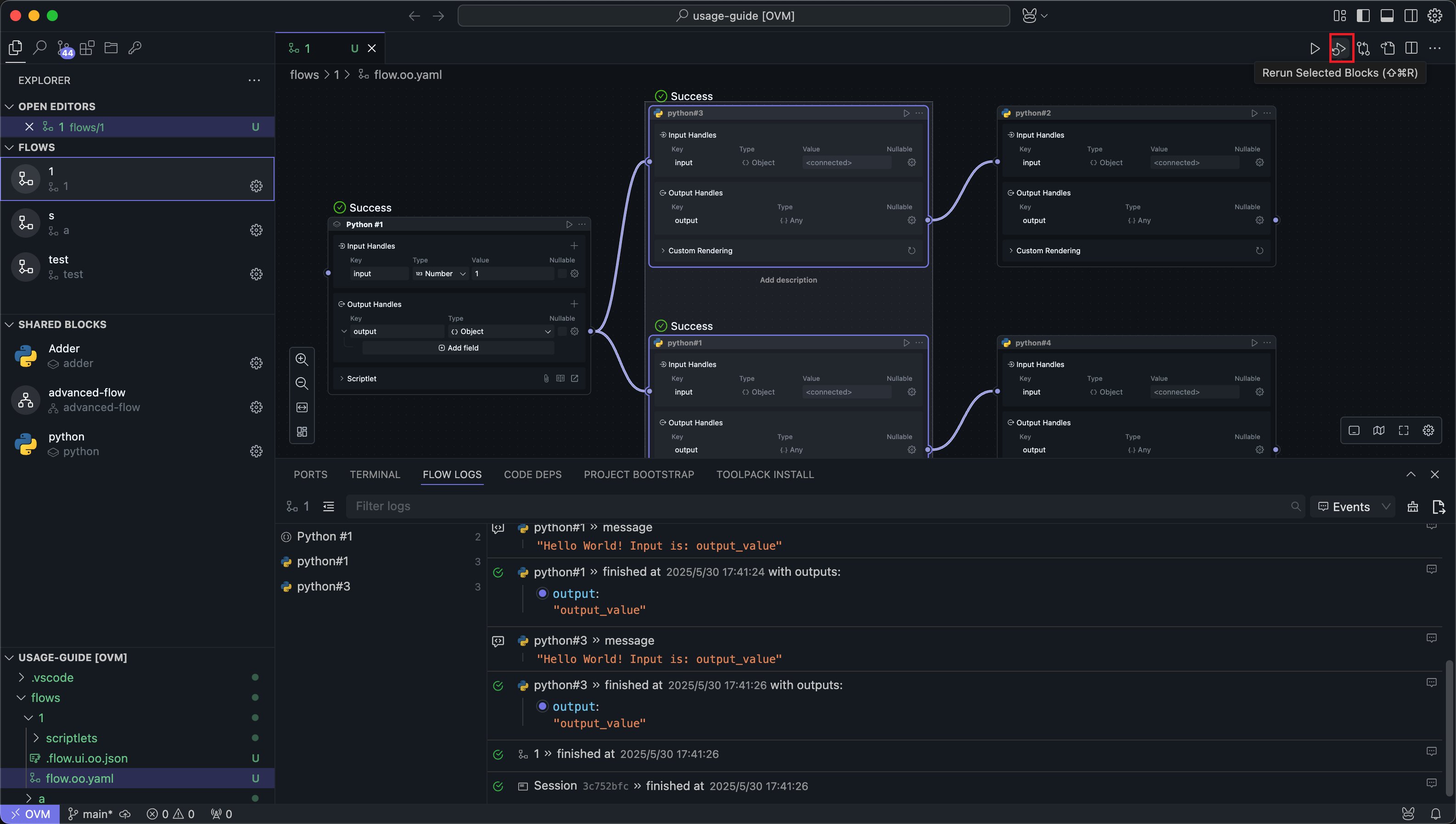 In the top menu of the central panel, click the leftmost run button to run the entire Flow.