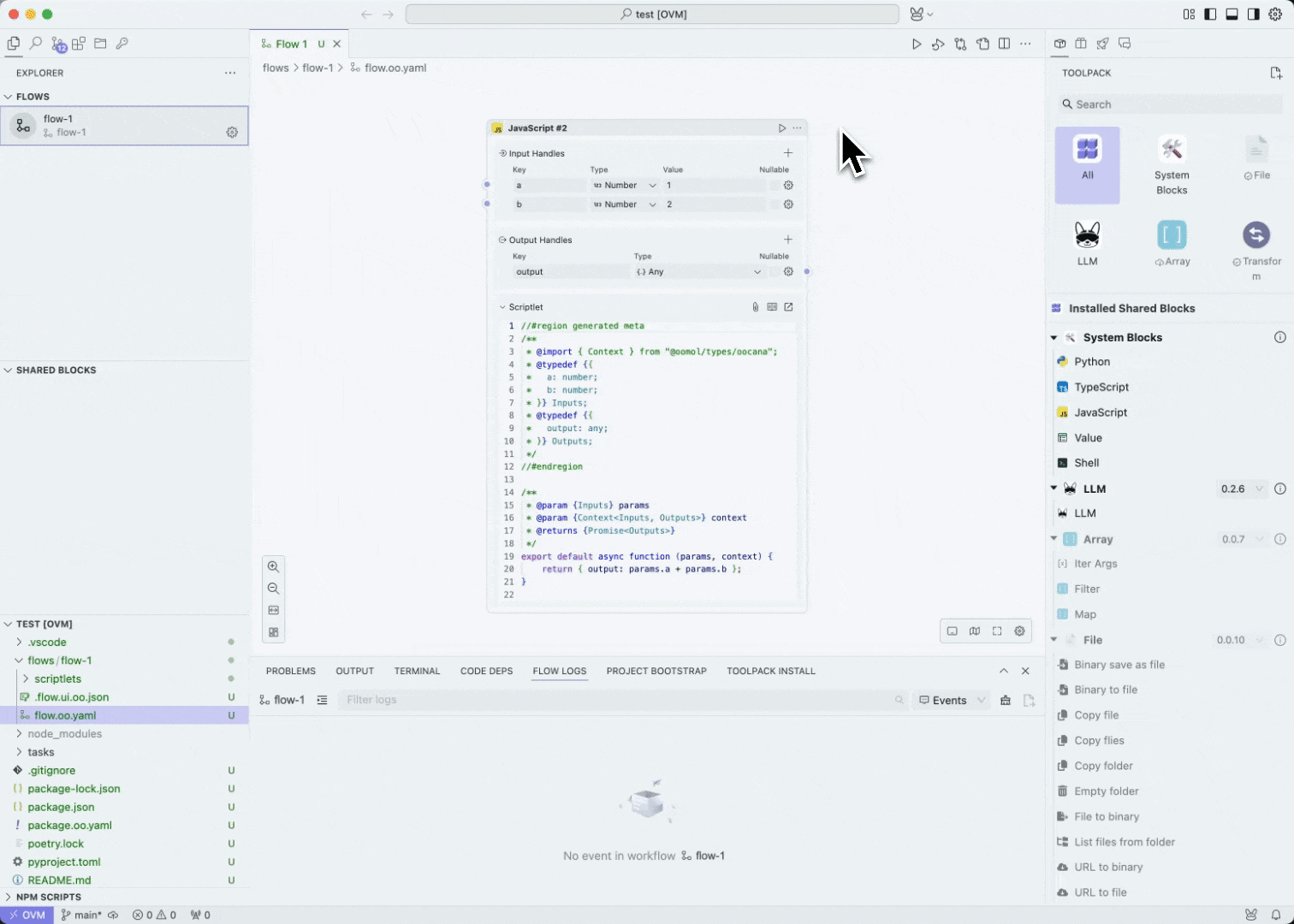 You can see that multiple blocks are combined together in the Flow, forming a complete Flow to calculate the length of the hypotenuse of a right triangle. Each task block can run and be tested independently. They can be reused in other Flows and can also be combined across different programming languages.