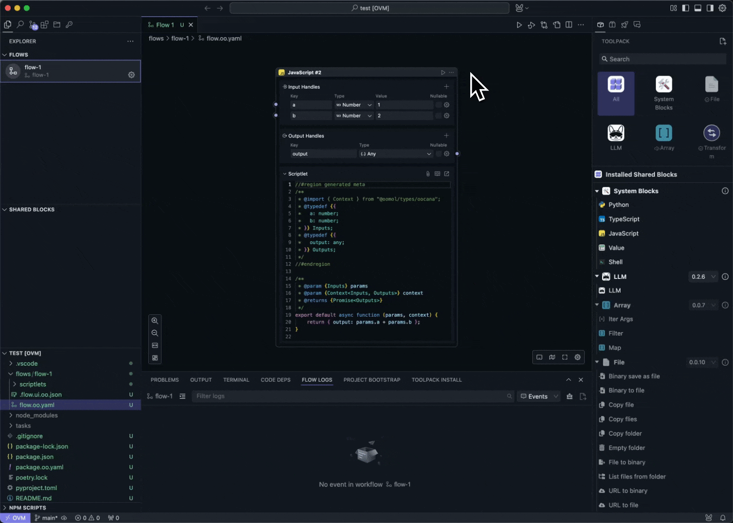 You can see that multiple blocks are combined together in the Flow, forming a complete Flow to calculate the length of the hypotenuse of a right triangle. Each task block can run and be tested independently. They can be reused in other Flows and can also be combined across different programming languages.